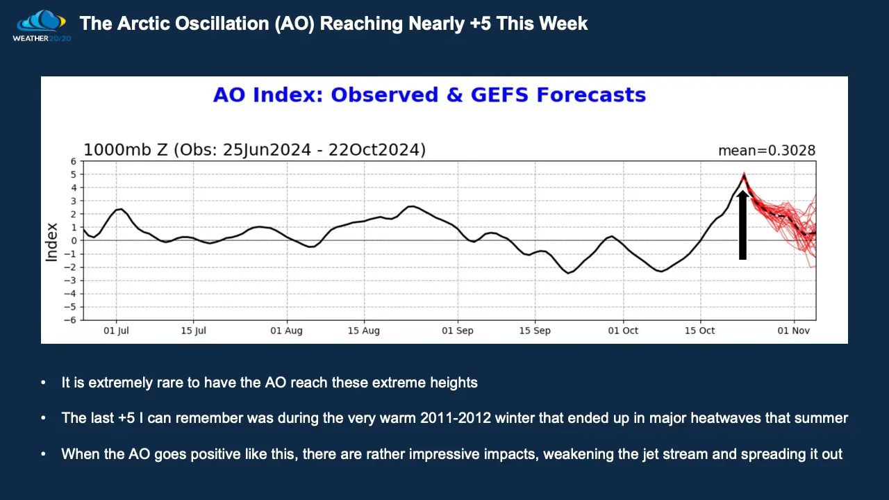 Below, we’ll compare the Arctic Oscillation (AO) Index from one year ago to today’s current setup, to see how the upper-level pattern may be influencing this early dryness.
