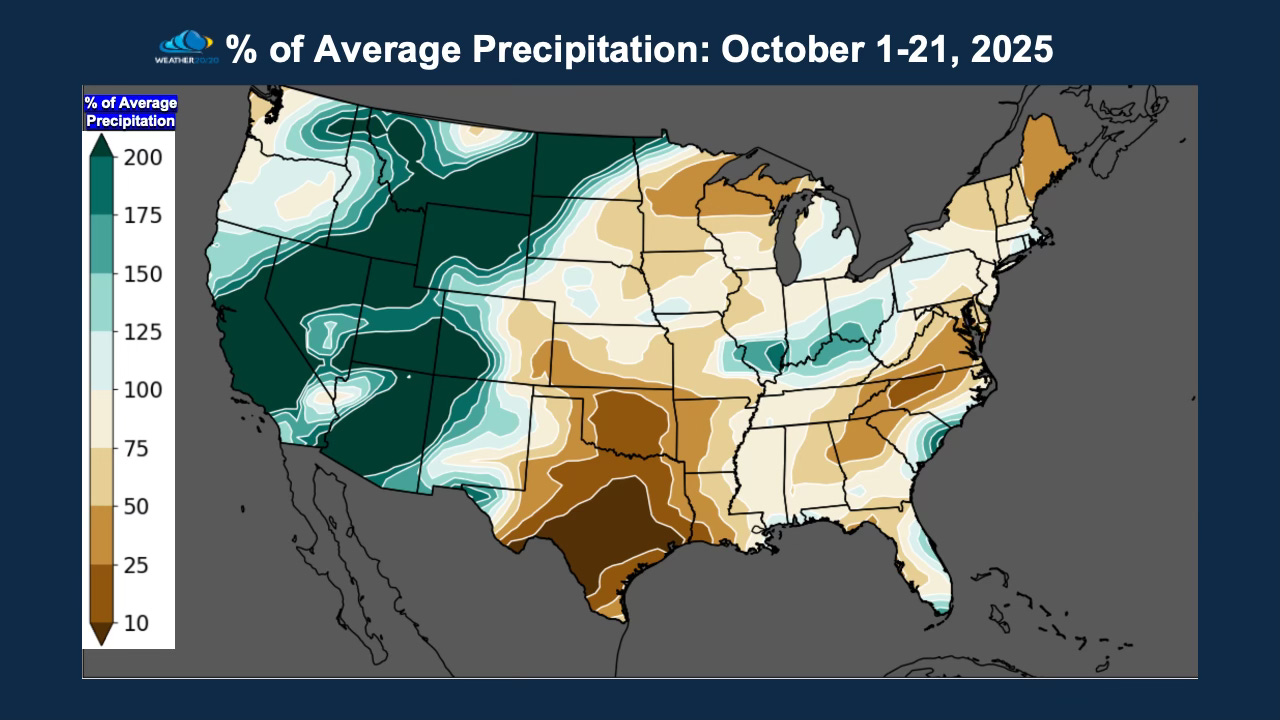 Here’s a look at the rainfall distribution across the United States over the past three weeks, highlighting the emerging wet and dry zones within the early stages of this new pattern: